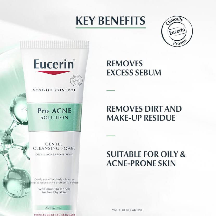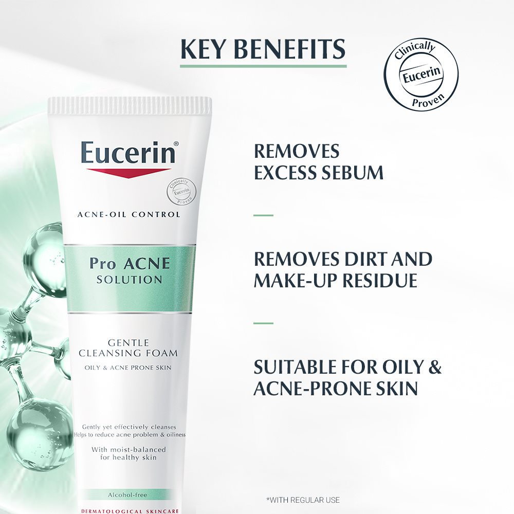 Eucerin ProACNE Solution Cleansing Foam is suitable for all types of skin, especially combination skin, oily and acne affected skin.